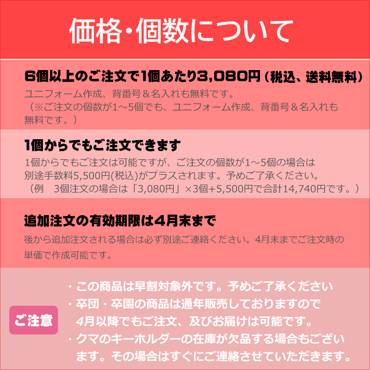 インクジェットプリントキーホルダーサッカースポーツから選ぶチームでおそろいバスケットボールバレーボールポリエステルラグビー創立・周年記念動物卒団・卒業記念恩師への贈り物野球 卒団、卒業記念 ユニフォーム クマさん キーホルダー【6個以上購入で1個3,080円】 ユニフォームの画像は別途info@osorogoods.jpまでお送りください 了解しました リボンシールについて 希望しない希望する 卒団キーホルダーは熨斗(のし)非対応です 了解しました デザイン確認していただいてからの制作開始となります(確認料金無料) 了解しました キーホルダーに入れるお名前、背番号を入力してください ご使用する日をお知らせください。 6つの価格帯のうち1つをお選びください。1~5個ご購入の場合は金額を訂正します。 選択してください(必須)1個ご購入/+5500円2個ご購入/+2750円3個ご購入/+1833円4個ご購入/+1375円5個ご購入/+1100円6個~(1個あたり3080円)ご購入/+0円 個数 123456789101112131415161718192021222324252627282930313233343536373839404142434445464748495051525354555657585960616263646566676869707172737475767778798081828384858687888990919293949596979899100 価格:6個以上ご購入の場合1個あたり¥3,080(税込) 1~4個ご購入の場合、別途¥5,500(税込)プラス お気に入りに追加お気に入りに追加済み 商品説明 ミニバス、バスケットボール、サッカー、野球など各種スポーツの卒団記念に!自分のチームのユニフォームデザインにお名前、背番号が個別で入る名入れクマさんキーホルダー レビュー レビュー投稿には、会員登録が必要です。会員登録する コメントをキャンセル 関連商品 Tシャツ 名入れTシャツ サッカー オーバーヘッドキック(半袖) 3,540円 プチフェイスタオル サッカー卒団記念【10枚以上購入で1枚3,050円】クマさん お名前、背番号、ユニフォーム、スローガンが入る今治製プチフェイスタオル プチフェイスタオル バスケットボール卒団記念【10枚以上購入で1枚3,050円】お名前、背番号、ユニフォーム、エンブレムが入る今治製プチフェイスタオル プチフェイスタオル バスケ卒団記念【10枚以上購入で1枚3,180円】お名前、背番号、日付、寄せ書き入りデザインの今治製プチフェイスタオル プチフェイスタオル バスケットボール卒団記念【10枚以上購入で1枚2,950円】お名前、背番号、スローガン入りバスケットゴールのデザインの今治製プチフェイスタオル プチフェイスタオル サッカー卒団記念【10枚以上購入で1枚3,050円】写真、お名前、背番号、ユニフォーム、エンブレムが入る今治製プチフェイスタオル Tシャツ 名入れTシャツ バスケットボール ネコディフェンス 3,540円 プチフェイスタオル バレーボール卒団記念【10枚以上購入で1枚3,050円】お名前、背番号、ユニフォーム、エンブレムが入る今治製プチフェイスタオル プチフェイスタオル バスケットボール卒団記念【10枚以上購入で1枚3,050円】お名前、背番号、ユニフォーム、日付、スローガン入りクマさん(Aタイプ) 今治製プチフェイスタオル プチフェイスタオル バスケットボール卒団記念【10枚以上購入で1枚3,050円】お名前、背番号、ユニフォームが入る今治製プチフェイスタオル プチフェイスタオル サッカー卒団記念【10枚以上購入で1枚3,050円】お名前、背番号、ユニフォーム、エンブレムが入る今治製プチフェイスタオル プチフェイスタオル 野球卒団記念【10枚以上購入で1枚3,050円】お名前、背番号、ユニフォーム、エンブレムが入る今治製プチフェイスタオル